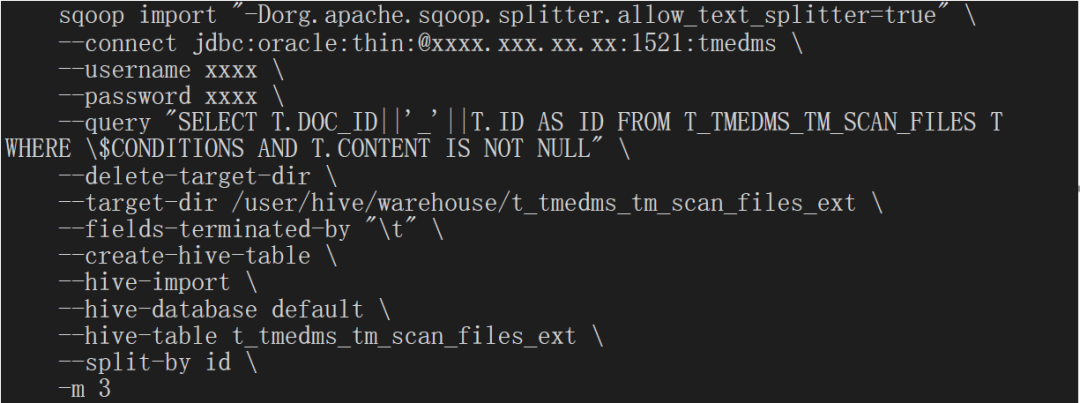 使用SQOOP执行数据迁移的目的是需要将Oracle中的结构化数据(ID)迁移到Hive中,然后在Hive中计算要预分Region的RowKey值: