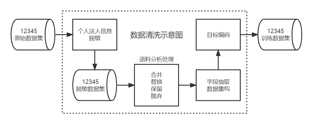 我们先对原始数据脱敏,去除个人、法人敏感信息,然后根据12345业务场景对脱敏数据进行有针对性的分析,采取了合并、替换、部分保留、抛弃等不同的清洗处理措施,并根据需要进行字段抽取和数据重构,对目标值重新编码,得到了最终适合训练的数据集。