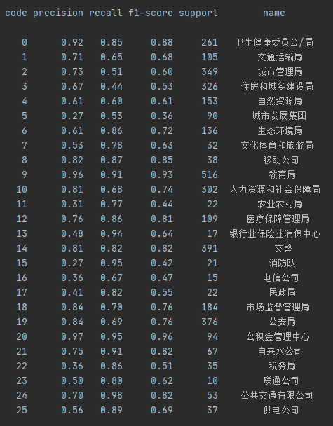 我们可以看到模型在信件分类中的查准率、查全率以及F1分数上都有较好的表现,特别是公积金中心、教育局、卫健委/局、移动公司、公交公司、公安局、市场监管局、人社局、医保局、交警等重要部门的信件,模型的分类效果均达到或超出预期。