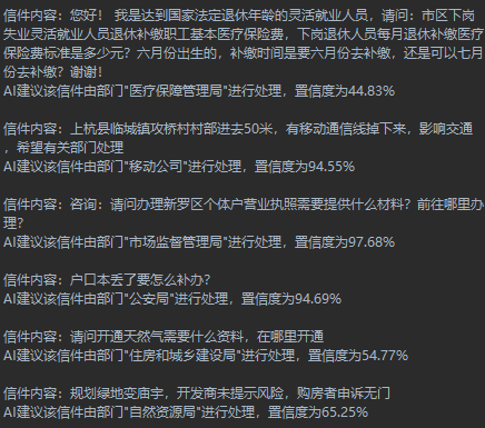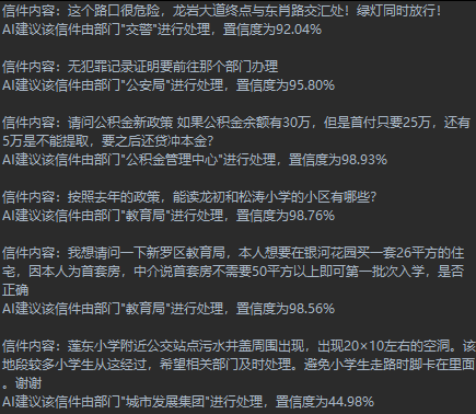 我们从某市12345平台(http://12345.longyan.gov.cn/)的公开件中随机抽取了20条信件记录,用训练好的模型对其处理部门进行预测,并对照12345平台的最终处理部门来判断模型的预测是否正确。结果发现模型全部预测正确,取得了相当不错的效果。预测情况部分截图如下所示: