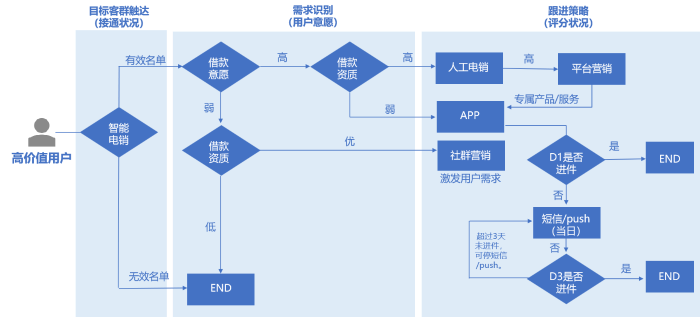 ②自动化智能化推广,在营销推广过程中除了通过人工客服、客户经理宣导等营销方式,还需要结合智能化工具,如智能客服、智能短信等,通过制定策略、设置规则,系统可实现自动拨打电话或推送短信,还可进行周期性的回访、监控。结合智能化推广工具,可以大大降低人工成本,提升工作效率。
